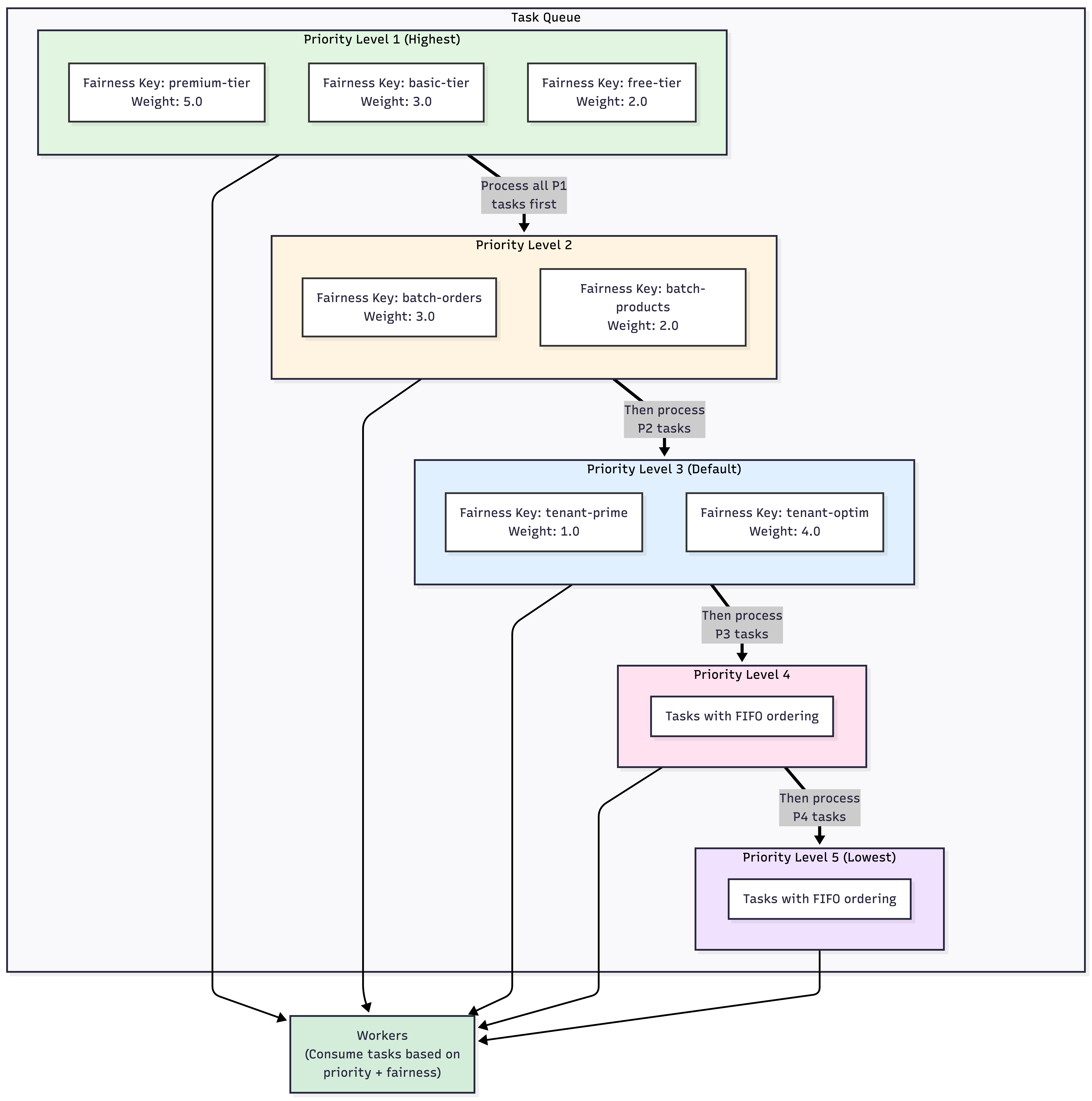 If you use Fairness without Priority, Tasks with different fairness keys will use a weighted distribution based on the fairness weights to allocate resources in the Task Queue. For example, say you have three fairness keys to describe customer tiers: free-tier, basic-tier, and premium-tier. You give premium-tier a fairness weight of 5.0, basic-tier a fairness weight of 3.0, and free-tier a fairness weight of 2.0. With Fairness, that means 50% of the time premium-tier Tasks dispatch, 30% of the time basic-tier Tasks dispatch, and 20% of the time free-tier Tasks dispatch from the Task Queue backlog.